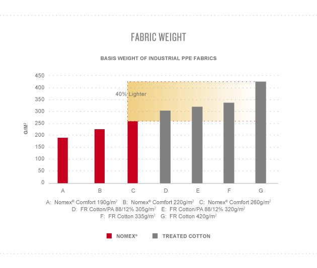 O peso dos tecidos de proteção típicos feitos de fibras Nomex® é de 150 g/m² a 265 g/m² – o que os torna até 40% mais leves que o algodão e misturas de algodão tratados com produtos químicos retardantes de chamas. As soluções da DuPont ajudam a fornecer melhor proteção contra calor e chama com um menor peso.
