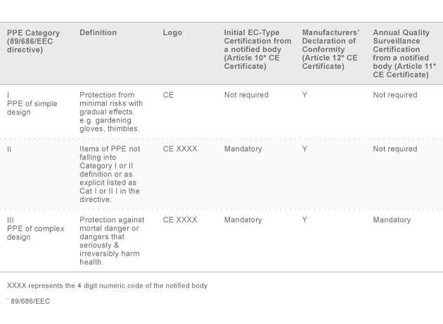 A diretiva de EPI (Equipamento de Proteção Individual) Europeia 89/686/EEC fala das "categorias de EPI". As vestimentas de proteção química devem ter certificação de CE como EPI de Categoria III. Essas vestimentas atendem aos requisitos mínimos de desempenho da norma específica do produto e são identificadas com a “marca de CE”, seguida por um código de 4 dígitos do órgão notificado e recebem um "certificado de CE" (certificado de exame tipo EC de acordo com o artigo 10 da diretiva de EPI).