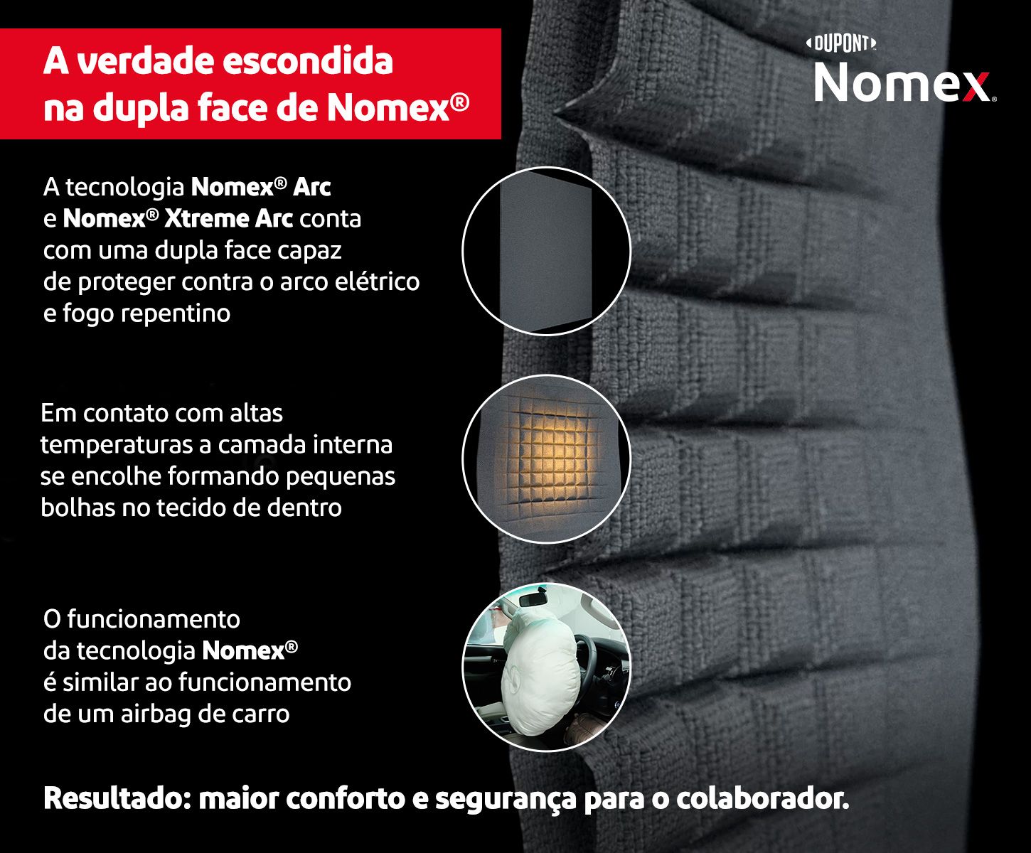 Dentre os produtos DuPont™ Nomex®, existe o Nomex® Arc e Nomex® Xtreme Arc. Assim como os airbags dos carros, que têm uma tecnologia que aciona um balão de ar ao sofrer uma batida, o mesmo acontece com Nomex® Xtreme Arc ao entrarem em contato com temperaturas elevadas. Quer ver como?