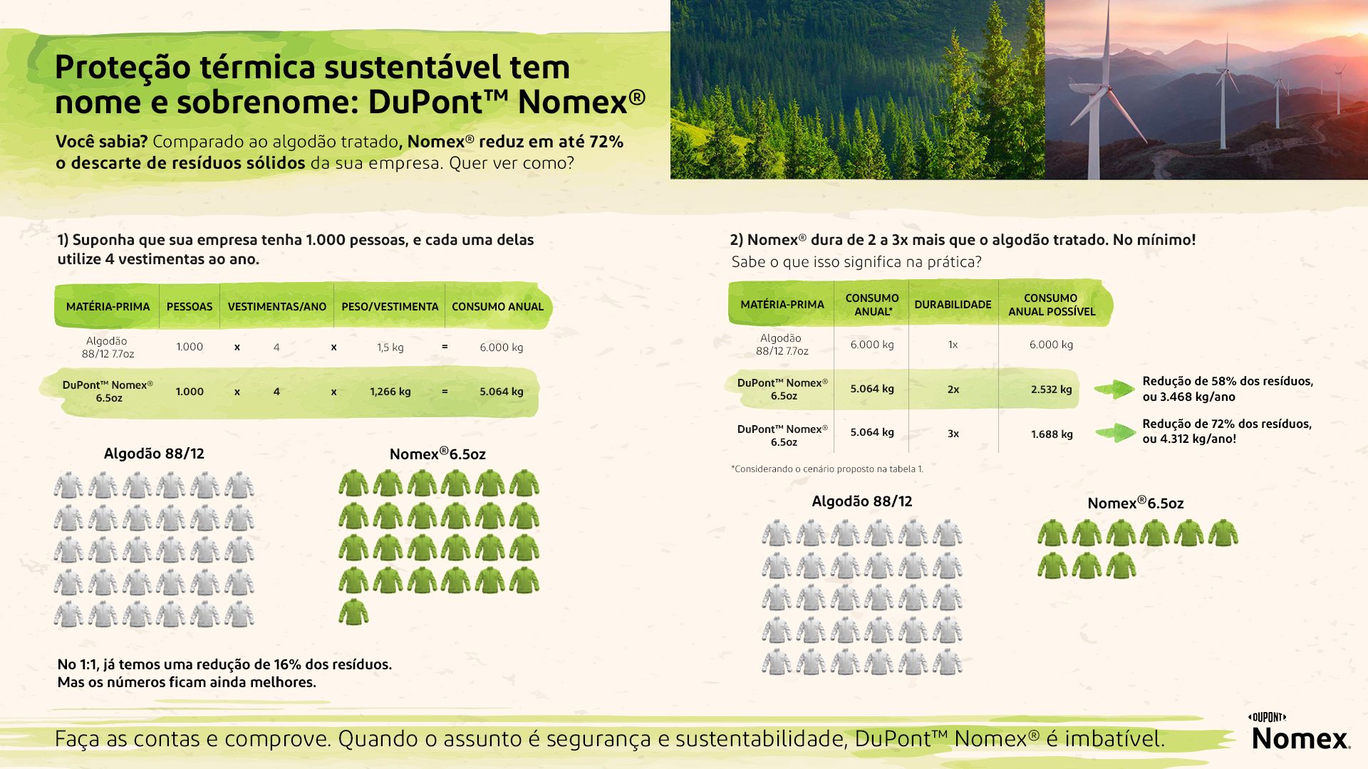 Seguro e resistente, DuPont™ Nomex® usa da sua alta durabilidade em relação a outros tecidos, para contribuir diretamente com a sustentabilidade. Com nossos vestuários feitos a partir de materiais inerentes, sua empresa além de ter um custo-benefício, também ajuda o meio ambiente.