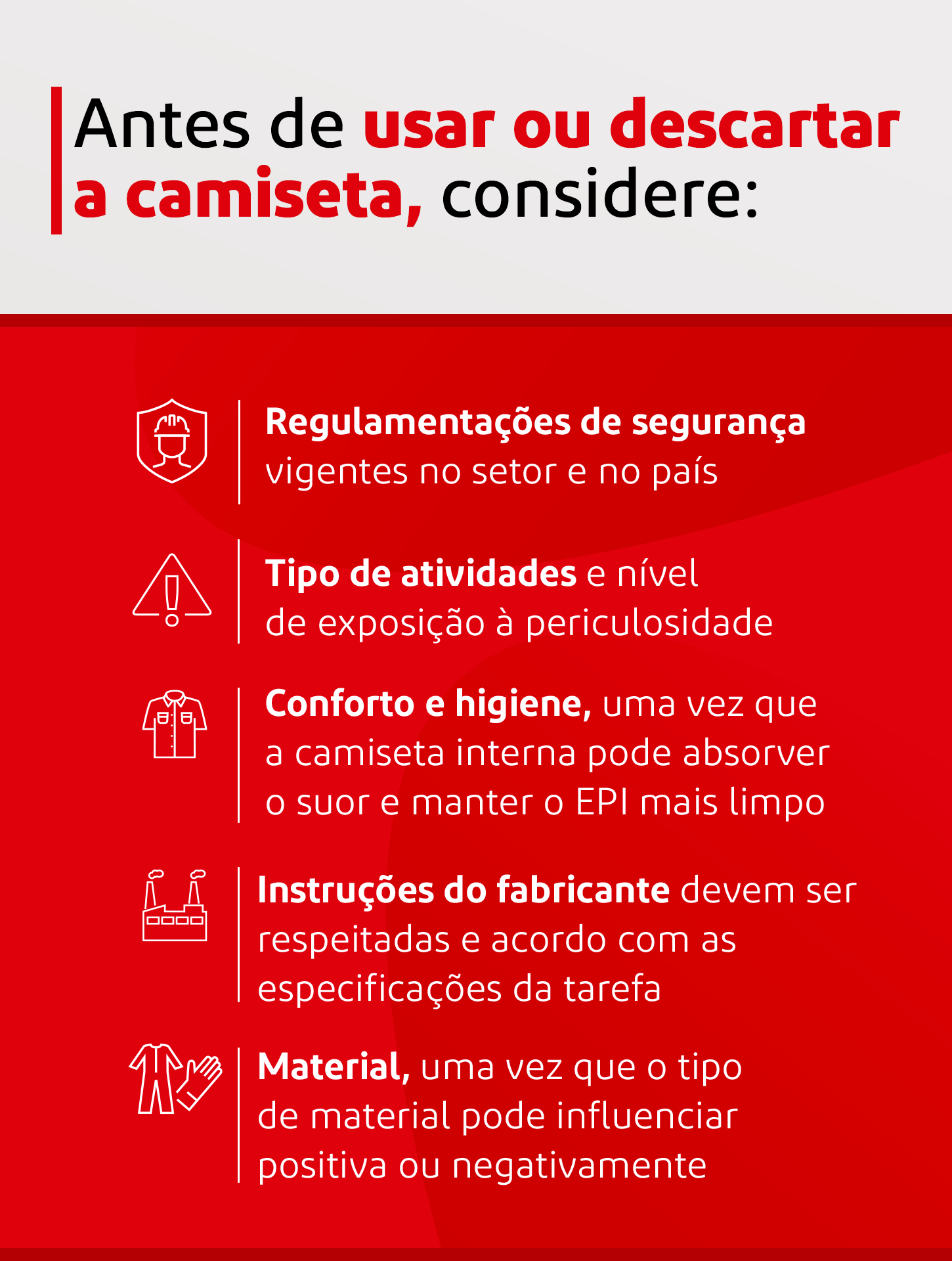 É essencial prevenir que o colaborador traje uma camiseta que não seja de tecido adequado, como é o caso de tecidos sintéticos que podem facilmente derreter no tronco e causar queimaduras de maior grau.