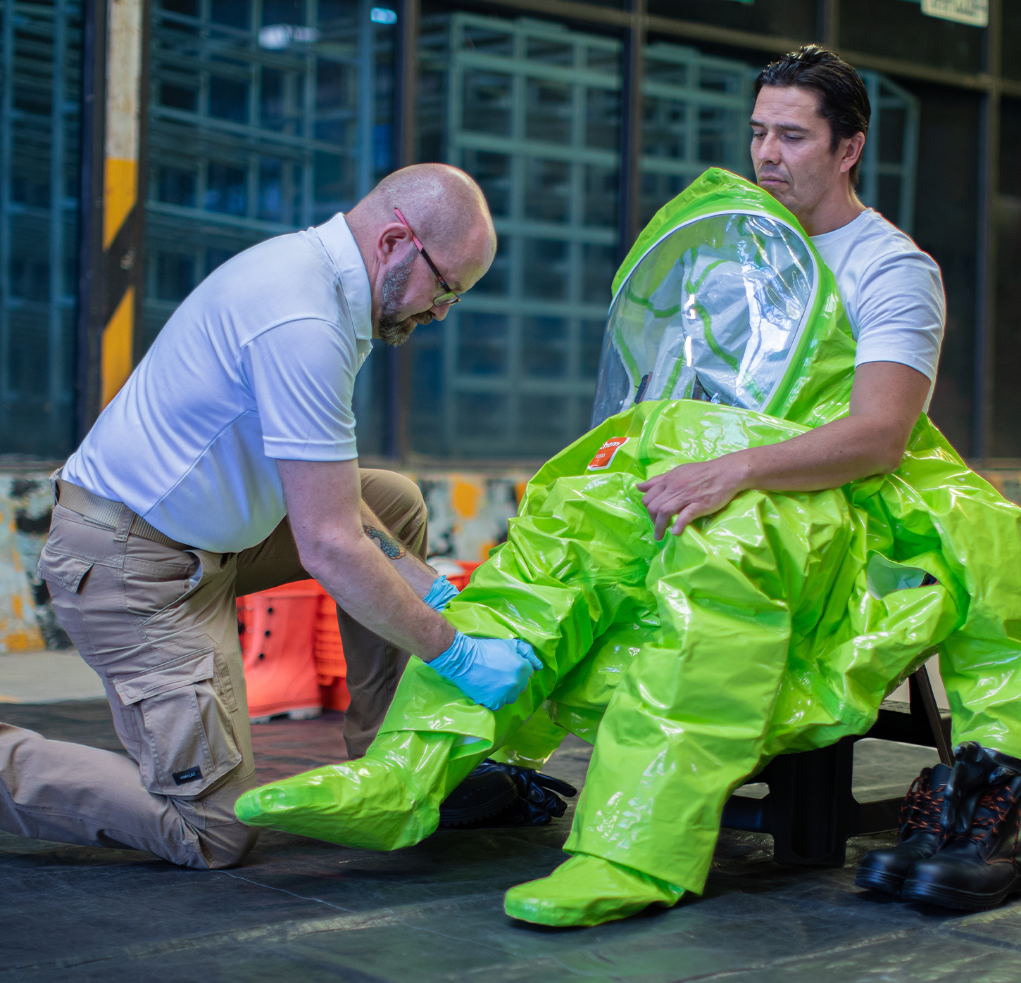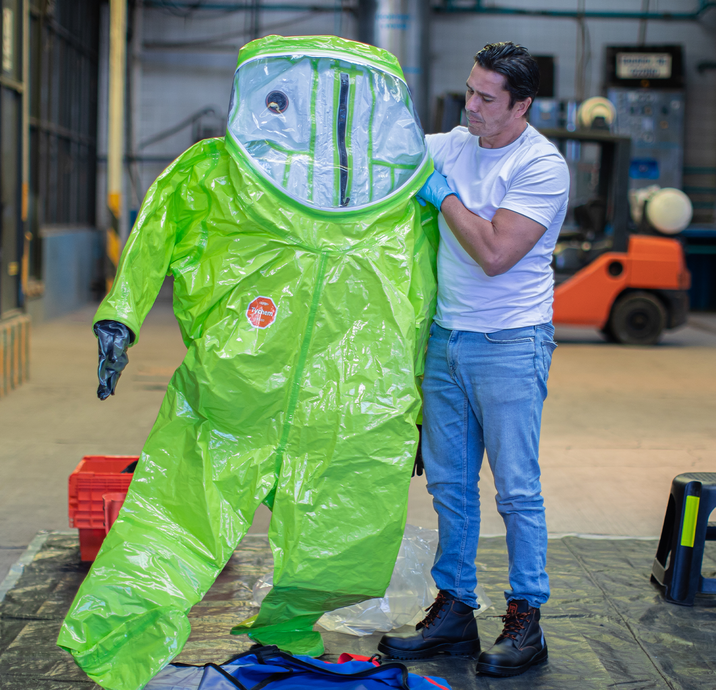 É importante ter um ajudante para te auxiliar ao colocar e retirar o traje, assim como seguir as etapas de descontaminação superficial externa para evitar contaminação do usuário (caso o brigadista seja exposto a uma situação de risco).
