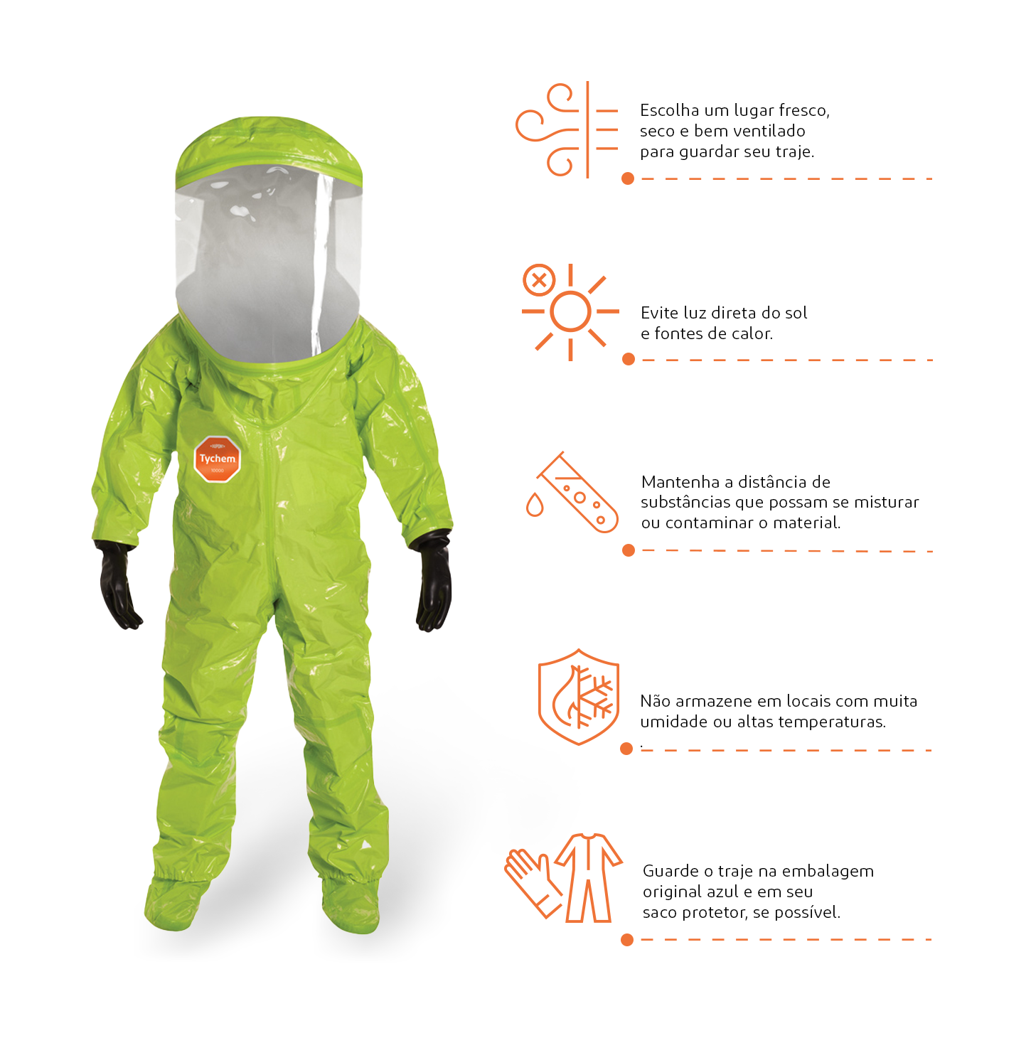 O traje Tychem® 10000 possui uma vida útil projetada a partir de testes de envelhecimento acelerado, resistência física e química em conjunto com o uso e armazenamento adequados.