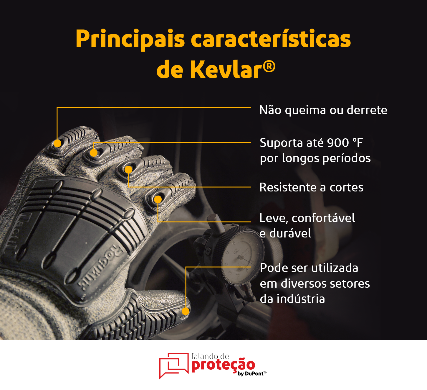 Kevlar® é uma tecnologia exclusiva da DuPont, composta por uma fibra sintética altamente resistente a agentes térmicos, cortes e abrasão, e seus atributos o tornam uma excelente escolha.