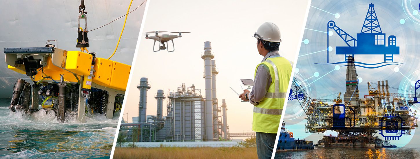 Em plataformas flutuantes do setor de óleo e gás, os drones são usados para inspecioná-las por toda sua extensão. E os robôs submarinos, rastejam mar adentro para testar e verificar equipamentos. Esse tipo de trabalho era feito por mergulhadores altamente treinados, em uma espécie de rapel submarino. Já os robôs, se movem dentro e fora d’água, por plataformas e tubulações.