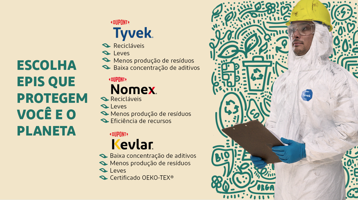 Pensando no bem-estar 360º dos profissionais da segurança do trabalho, nós produzimos vestimentas à prova de qualquer perigo. E, além de proteger o trabalhador contra diversas ameaças e produtos químicos, DuPont™ Tyvek®, DuPont™ Nomex® e DuPont™ Kevlar®, por exemplo, têm vantagens que só fazem bem para quem usa e para o meio ambiente: