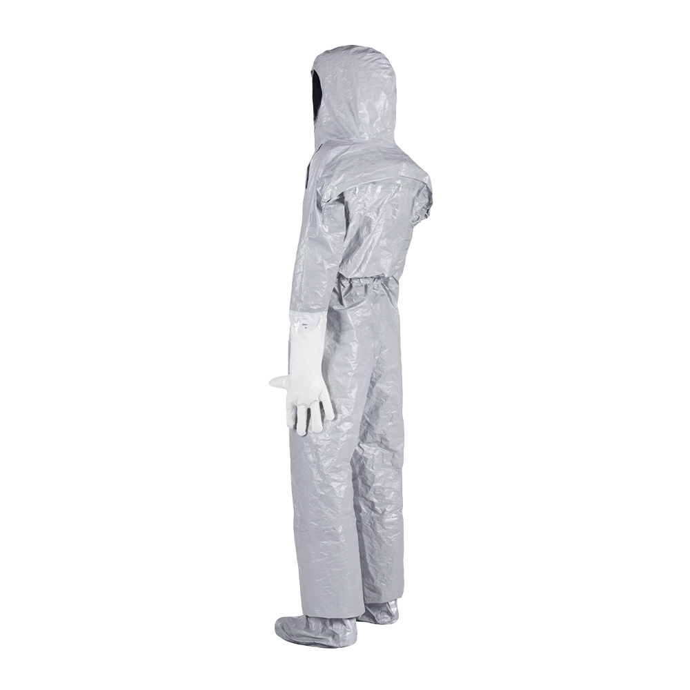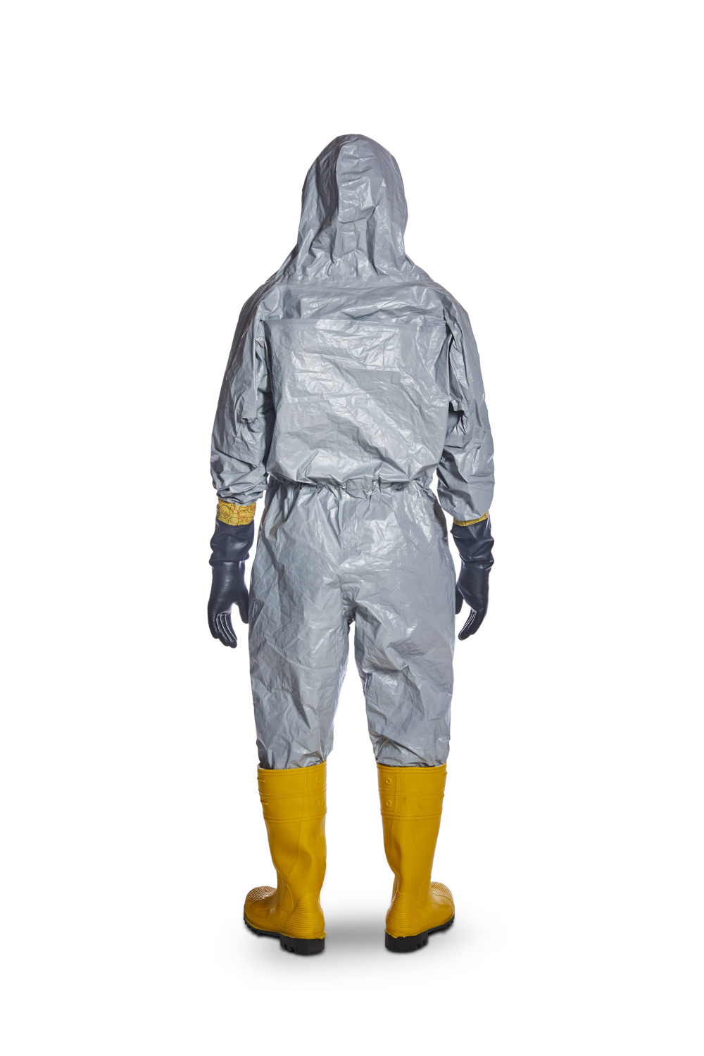 DuPont™ Tychem® 6000 F FaceSeal. Macacão. Capuz com vedação de borracha na face. Meias acopladas. Luvas internas acopladas. Costuras termosseladas. Cor cinza.