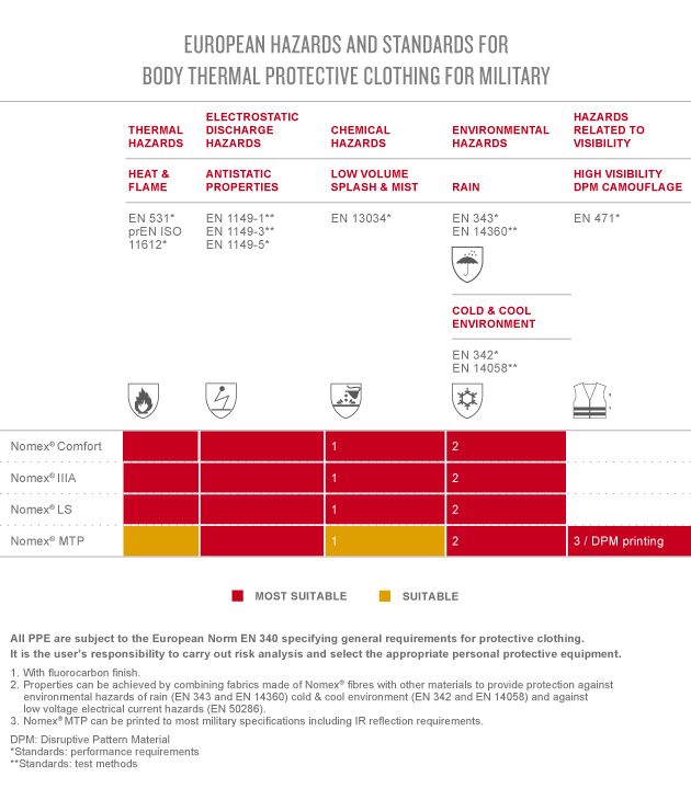Tripulações de submarinos e marinheiros, tropas de infantaria, equipes de veículos MRAP (Mine-Resistant Ambush Protected, protegidos contra emboscadas e resistentes a minas), desativadores de minas, paramédicos e equipes de logística, todos encontraram soluções confiáveis nos uniformes feitos de fibra Nomex®, quer seus perigos estejam em fogo repentino, incêndio, explosão, arco elétrico, respingos de metais derretidos, descarga estática ou produtos químicos.
